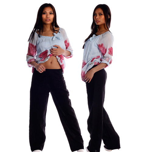 Material: 100% Leinen. Zwei aufgesetzte Taschen. Flexibler Gummibund.