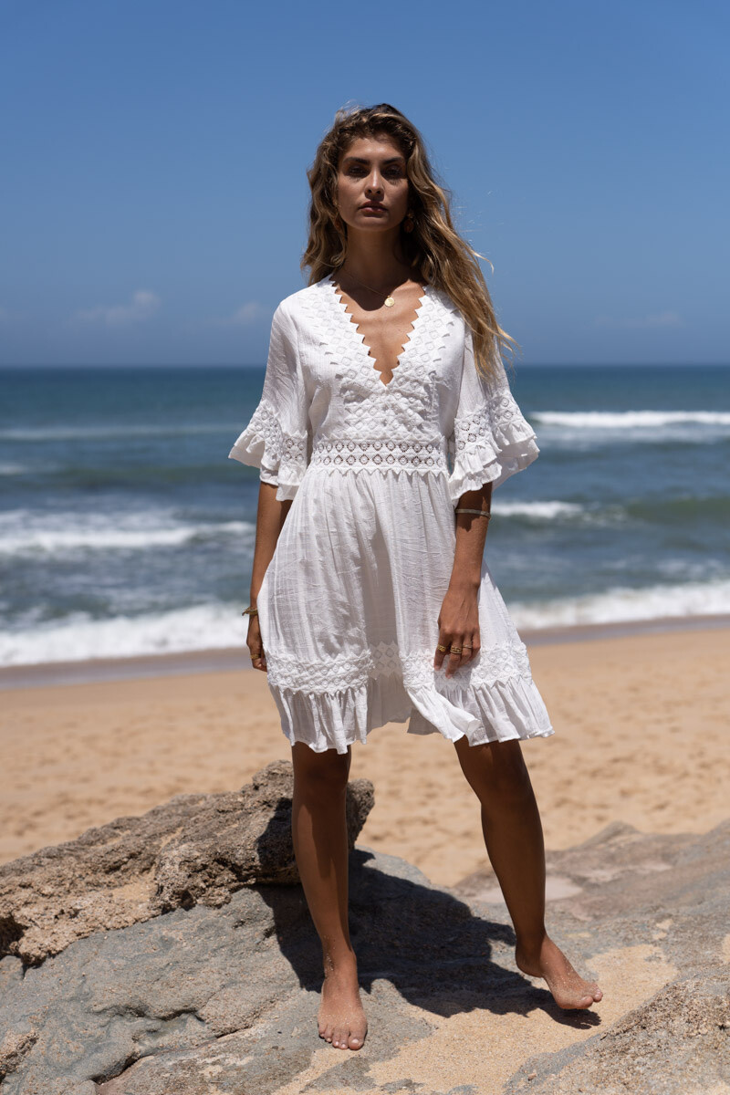 Obermaterial: 52% Viskose, 48% Polyester. Unterstoff: 100% Viskose. Blickdicht durch doppelten Unterstoff. Halbarm V-Ausschnitt Knielang.