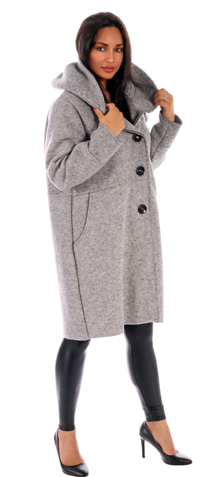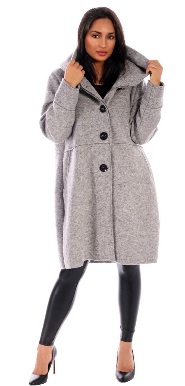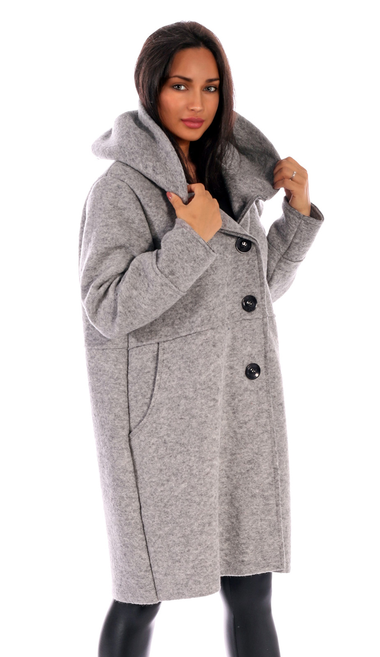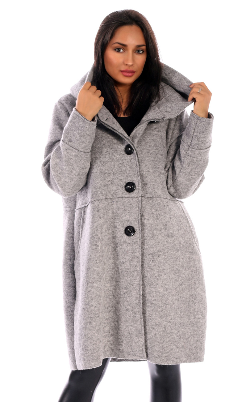 Wollmantel zum Knöpfen mit Kapuzen-Schalkragen Einheitsgröße: 36 - 44. Obermaterial: 80% Wolle, 20% Polyester. Futter: 100% Polyester. 2 große Eingriffstaschen.